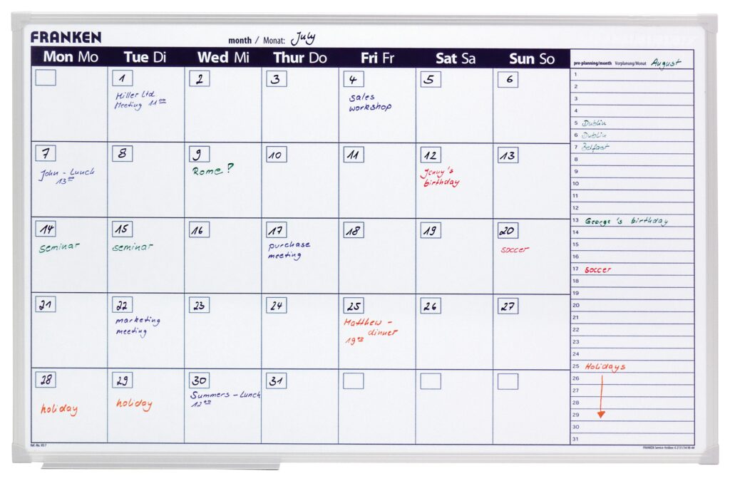 Mesečna planer tabla 60×90 cm / sedmodnevna radna nedelja Franken
