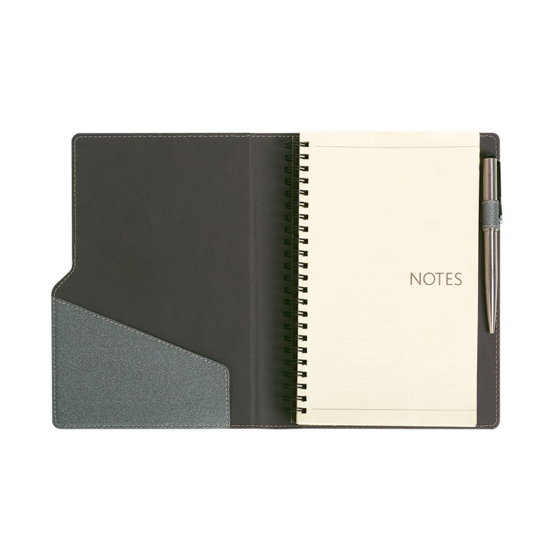 Notes modernog dizajna i vrhunskog kvaliteta proizveden od termoreaktivne eko kože, prošivenih korica. Knjižni blok je napravljen od finog šamoa papira koji je povezan spiralom. Notes na unutrašnjoj strani korice ima džep. Artikal je idealan izbor za beleženje svakodnevnih aktivnosti, sa posebnim prostorom za olovku. Luksuzno pakovan u crnoj kutiji može biti idealan poklon za poslovne prijatelje i saradnike.