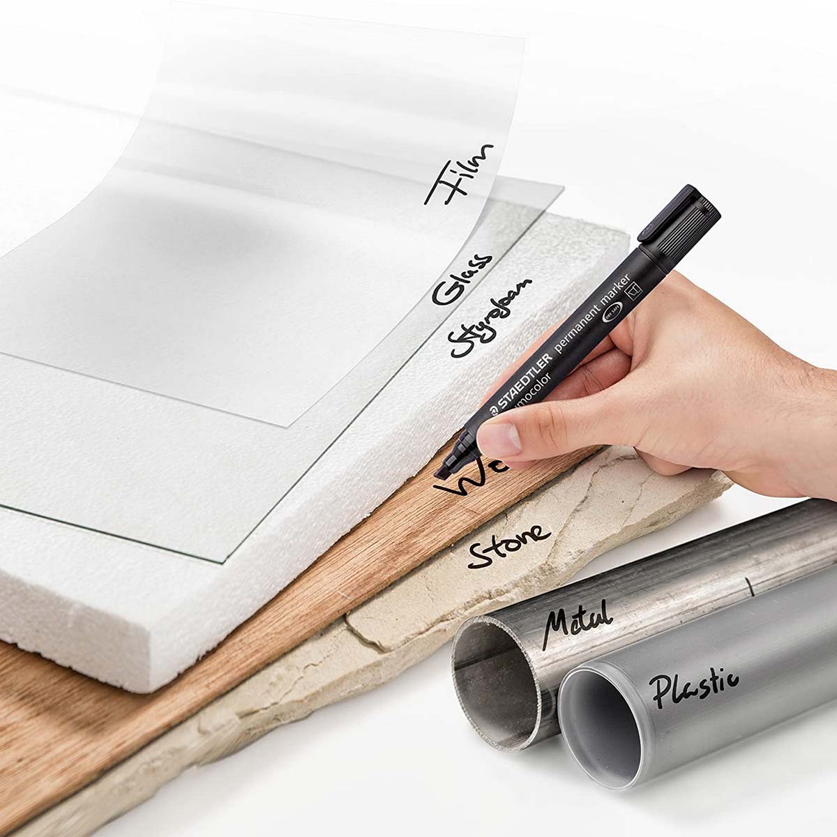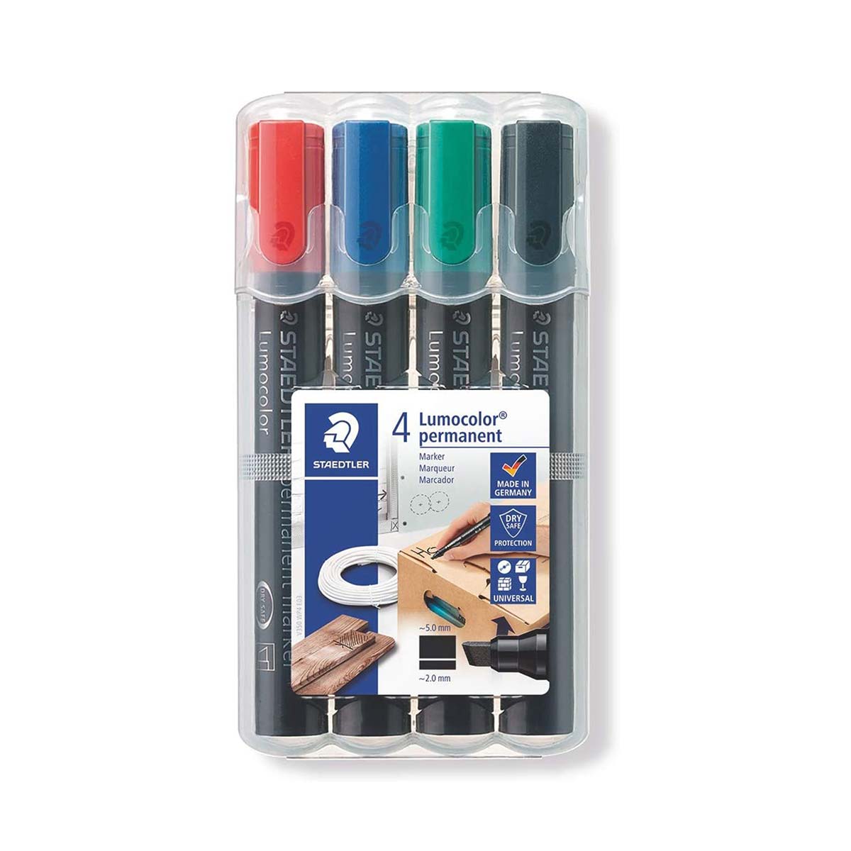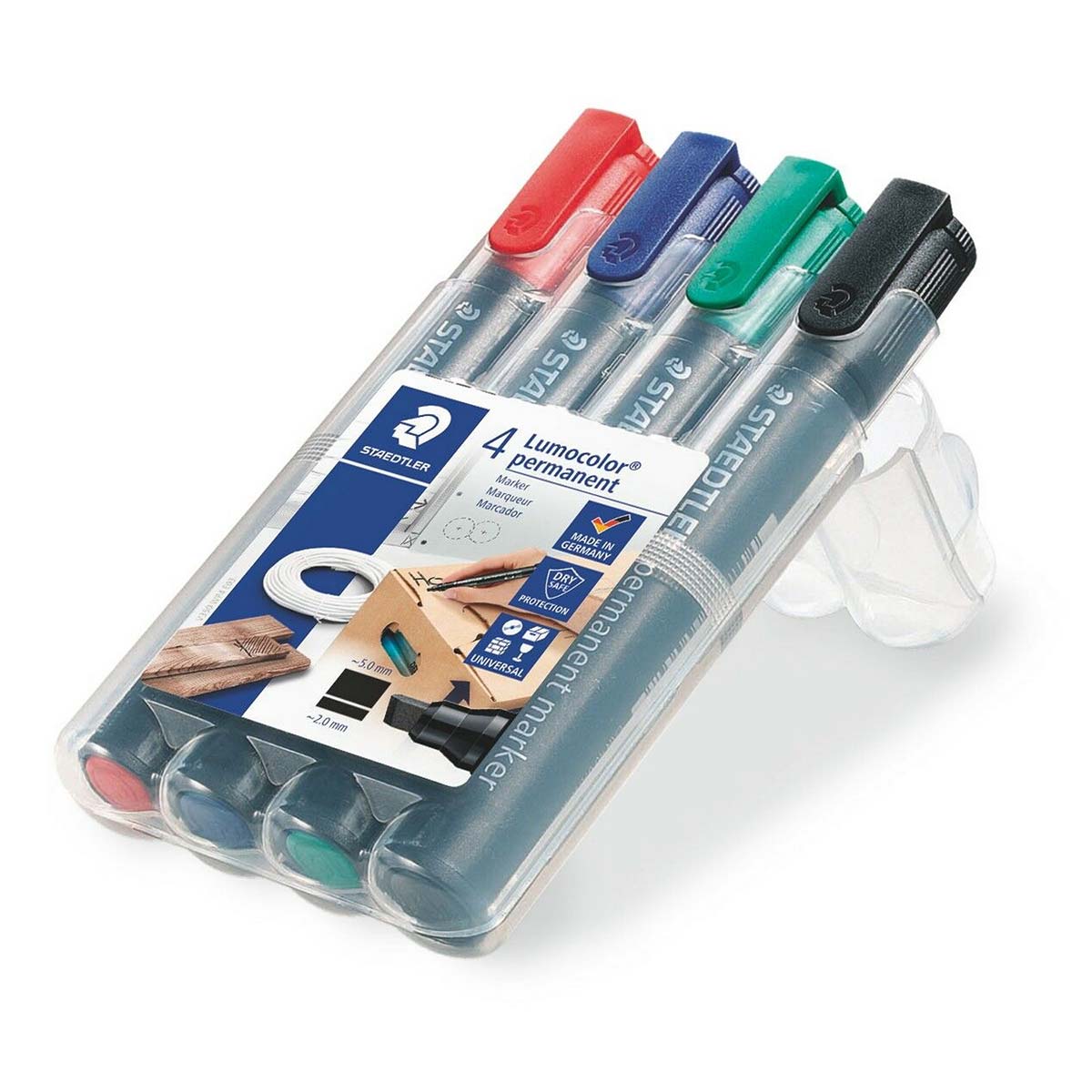 Staedtlerov premium permanentni markeri sa kosim vrhom u setu od 4i različite boje. Vodootporan na gotovo svim površinama. Suši se za nekoliko sekundi što je idealno i za levoruke korisnike. Intenzivne boje. Može se danima ostavljati bez poklopca a bez isušivanja markera. Širina ispisa 2,0-5,0mm. Ponovno punjenje sa refil stanicom 488 50.