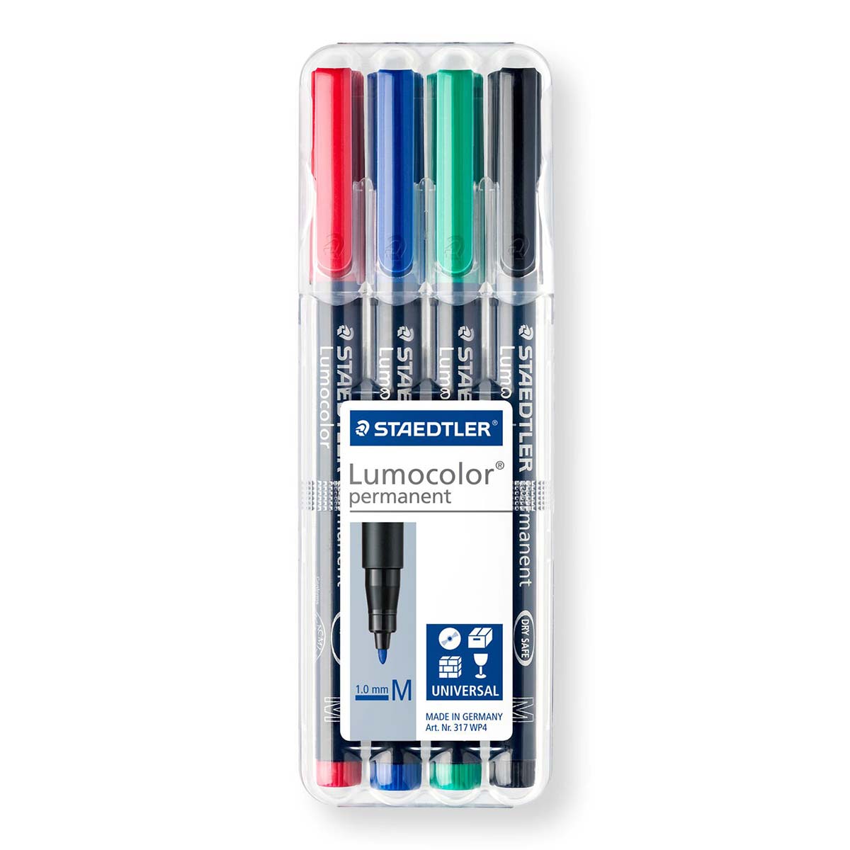 Staedtler Lumocolor permanent 317. Univerzalni marker za sve površine. Otpornost na mrlje i vodootporan na gotovo svim površinama. Suši se za nekoliko sekundi stoga idealno i za levoruke korisnike. Dugotrajno mastilo. Može se danima ostavljati bez poklopca a bez isušivanja. Širina ispisa M, približno 1,00mm. Ponovno punjenje s refil stanicom 487 17. Set sadži 4 različite boje.