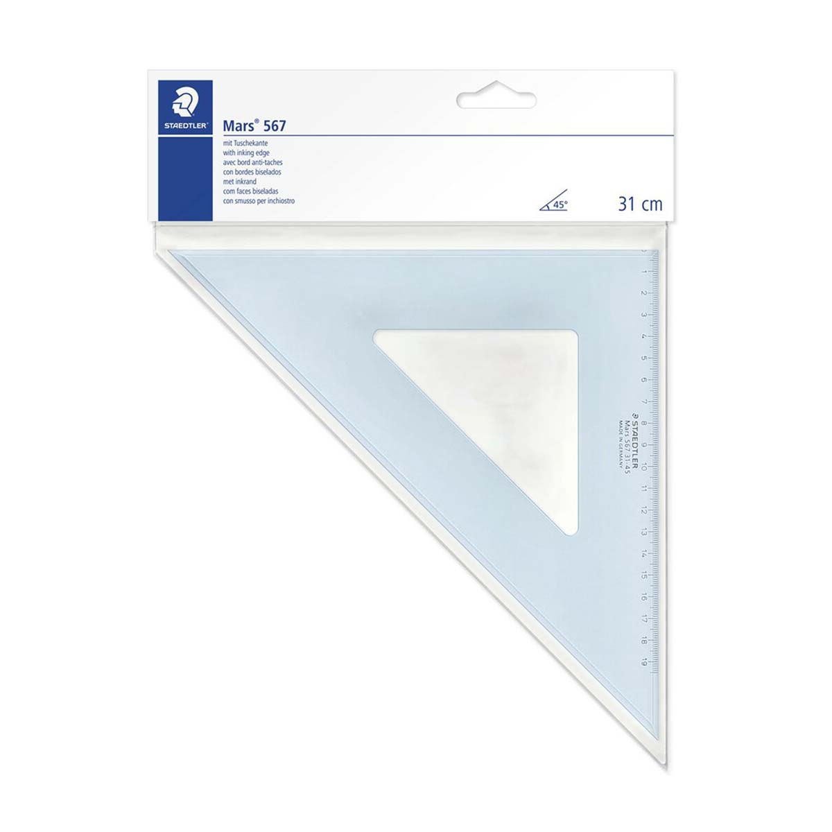 Prepoznatljivi Staedtler kvalitet u izradi lenjira i trouglova. Transparentni trougao. Izrađen od visokokvalitetne plastike. Zaobljene ivice. Visoki kvalitet obeleživača brojeva i linija. Individualno pakovanje u foliji. Odignuta ivica koja sprečava podlivanje mastila. Dužina 31cm, ugao 45.