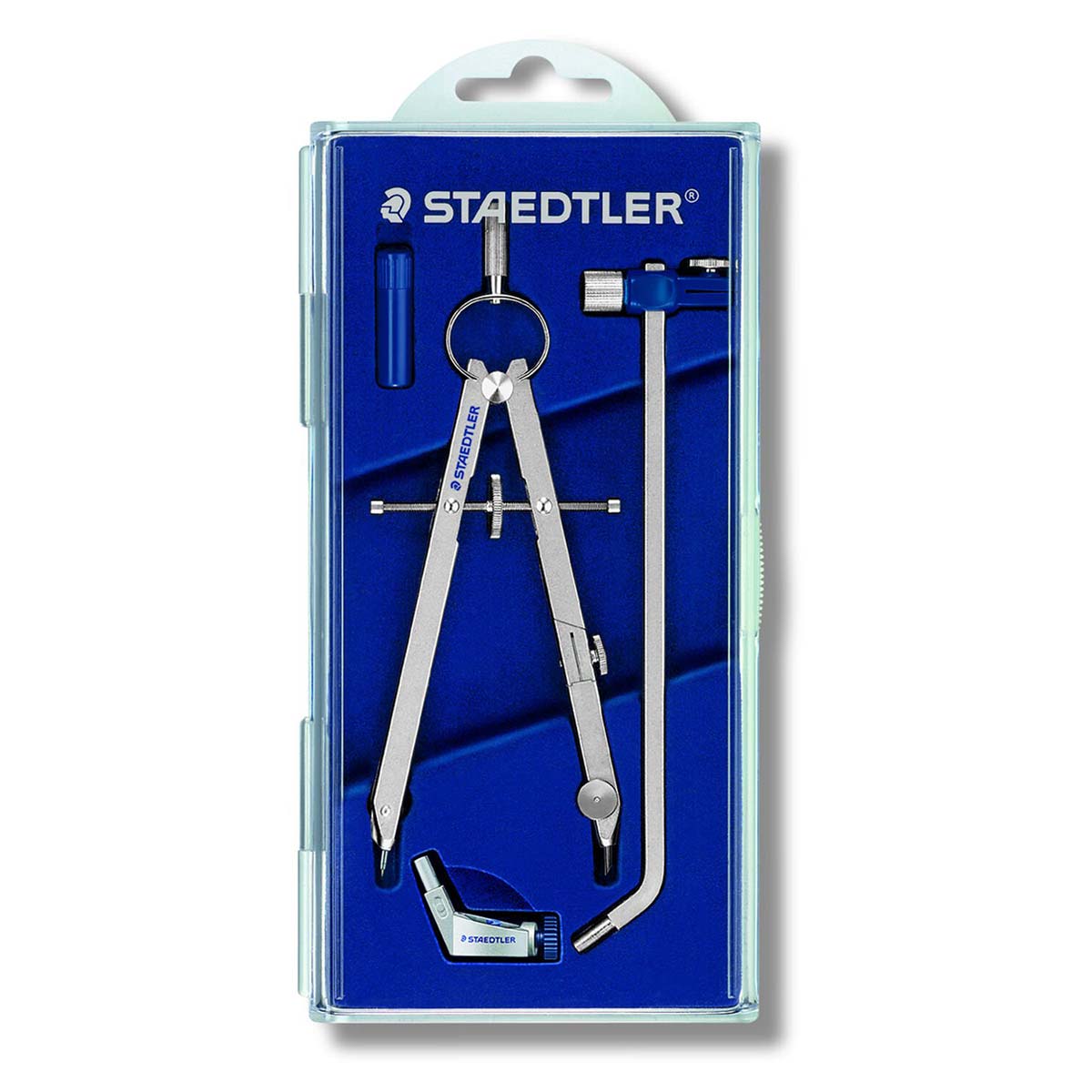 Staedtler precizni metalni šestar sa minom, centralnim točkićem, mehanizmom za brzo podešavanje i dodatnim adapterom za olovku. Maksimalni prečnik kruga 265mm, sa adapterom oko 500mm. Dužina 156mm. Šestar ima zaštitni poklopac koji štiti iglu i minu šestara.